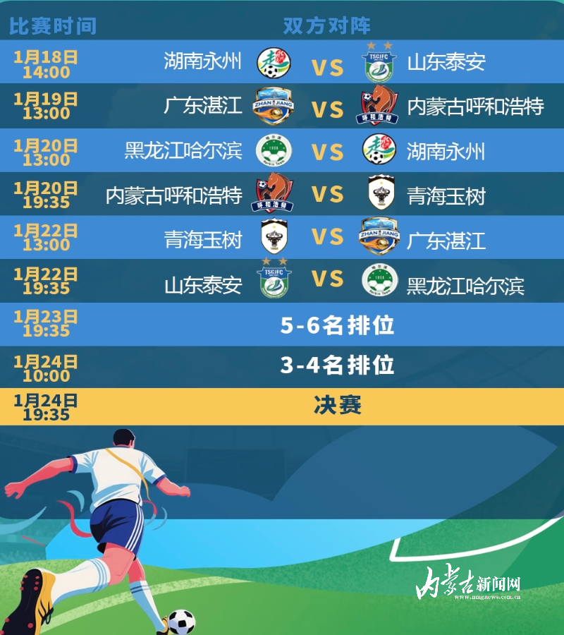 群众足球风云再起,一场汇聚南北、融合竞技与文化的群众足球盛宴即将激情上演。1月18日至1月24日,CMG群众足球邀请赛将在湖南省永州市拉开帷幕。1月11日晚,抽签结果正式揭晓,呼和浩特队将于1月19日首战粤超冠军广东湛江队。球队将于1月16日启程,在永州进行合练。