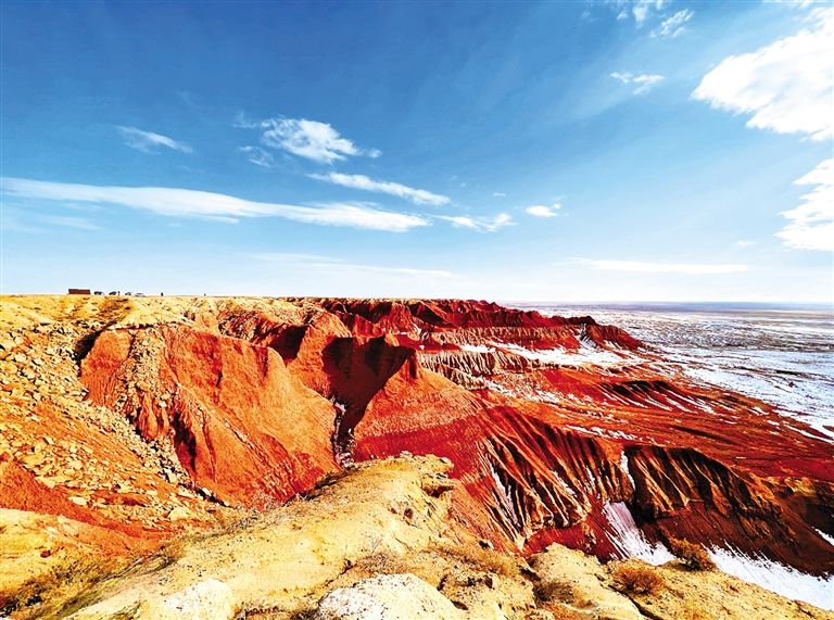 四子王旗大红山,赤色丹霞地貌与雪原戈壁相映,绘就塞北独有的苍茫壮阔。王锦业 摄