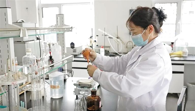 内蒙古洁泰诺生物科技有限公司质检中心工作人员进行取样分析。杨丽芳 摄