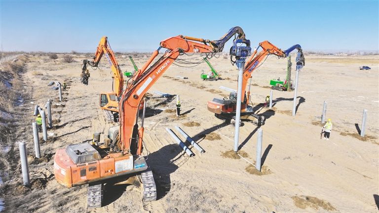 引孔机、打桩机轰鸣声不绝于耳,打桩机将一根根水泥桩“钉”入地面中……连日来,巴彦淖尔市临河区新华林场防沙治沙和光伏一体化项目施工现场多台作业车辆同时进行桩基作业,现场还不时有工作人员对打桩等基础工作进行抽检抽查,确保施工质量。