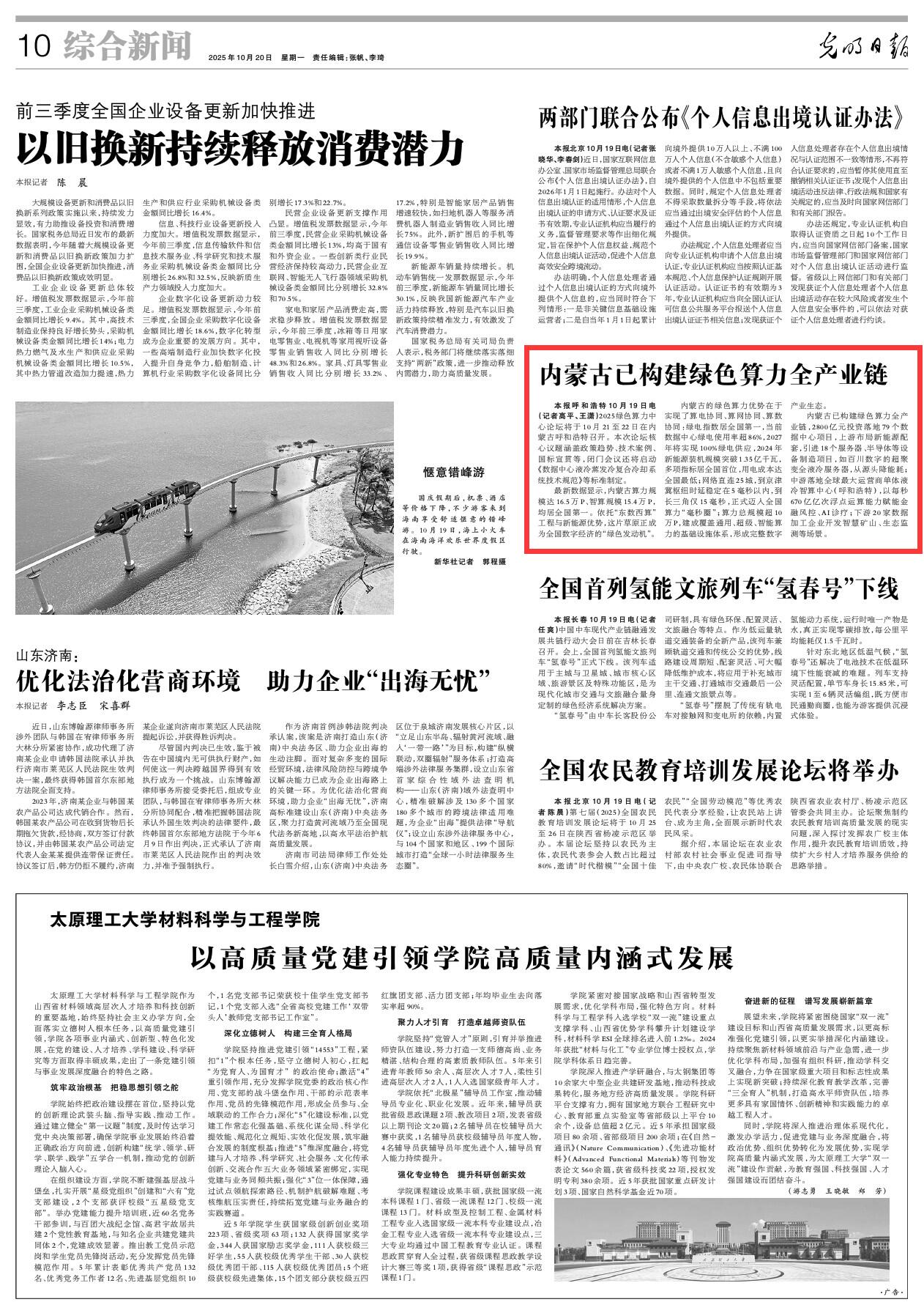 2025年10月20日《光明日报》第10版刊发了《内蒙古已构建绿色算力全产业链》的文章,报道了2025绿色算力中心论坛将于10月21至22日在内蒙古呼和浩特召开。最新数据显示,内蒙古算力规模达16.5万P、智算规模15.4万P,均居全国第一。依托“东数西算”工程与新能源优势,这片草原正成为全国数字经济的“绿色发动机”。