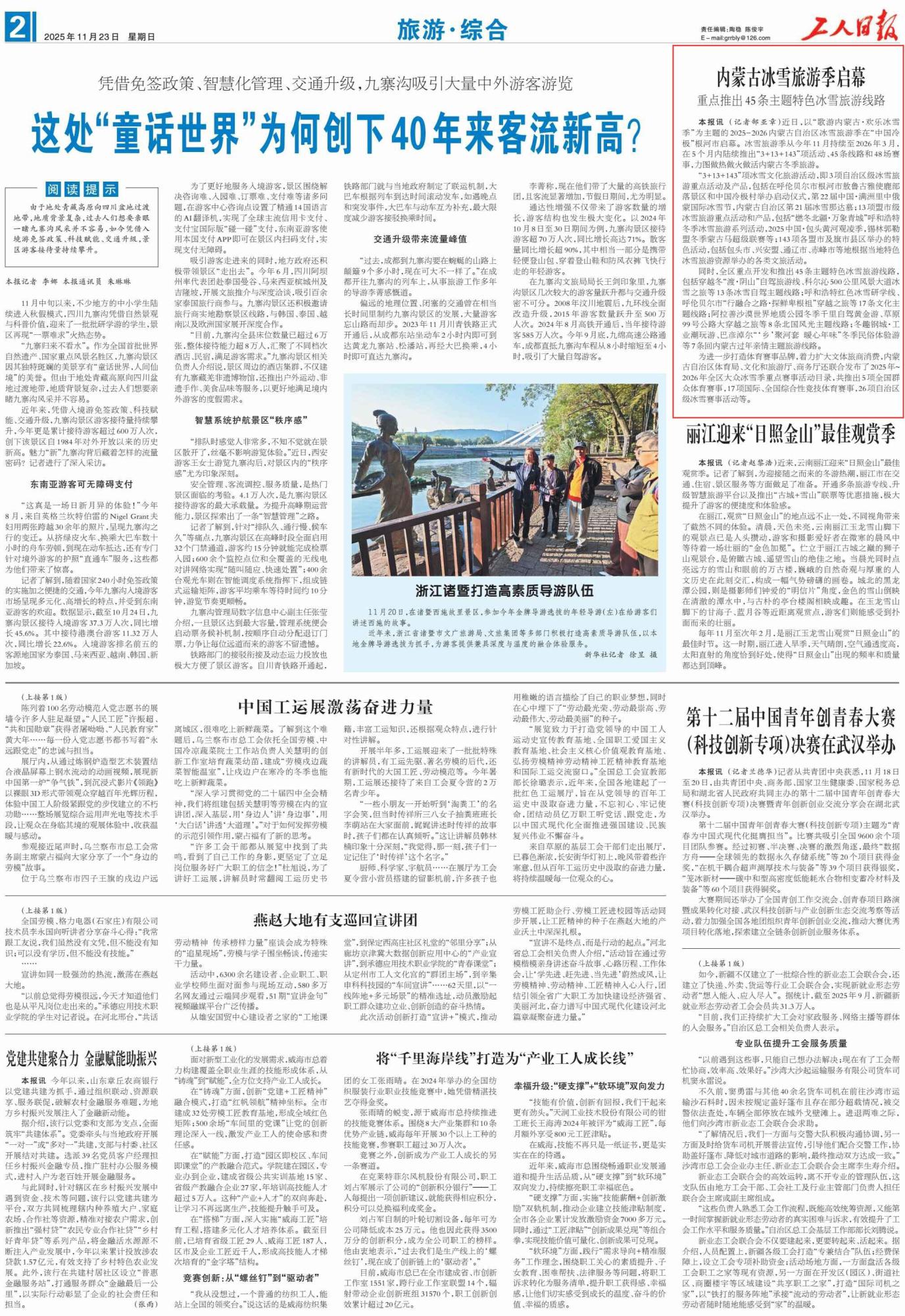 2025年11月23日,《工人日报》第2版刊发题为《内蒙古冰雪旅游季启幕 重点推出45条主题特色冰雪旅游线路》的文章,报道了2025-2026内蒙古自治区冰雪旅游季近日在“中国冷极”根河市启幕。冰雪旅游季从今年11月持续至2026年3月,陆续推出“3+13+143”项活动、45条线路和48场赛事。