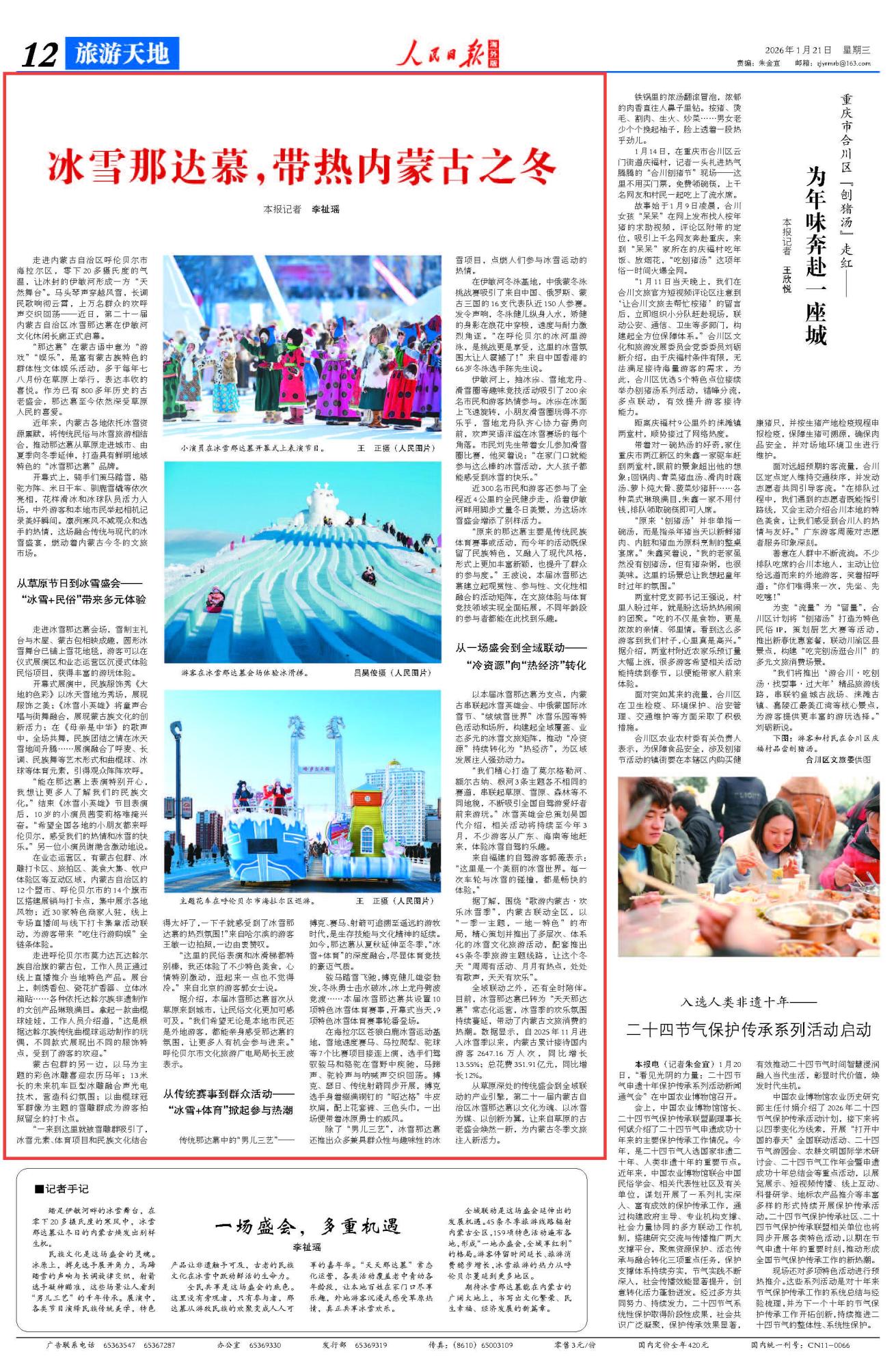 2026年1月21日《人民日报海外版》第12版刊发了《冰雪那达慕,带热内蒙古之冬》的文章,报道了近年来,内蒙古各地依托冰雪资源禀赋,将传统民俗与冰雪旅游相结合,推动那达慕从草原走进城市、由夏季向冬季延伸,打造具有鲜明地域特色的“冰雪那达慕”品牌,为内蒙古冬季文旅注入新活力。