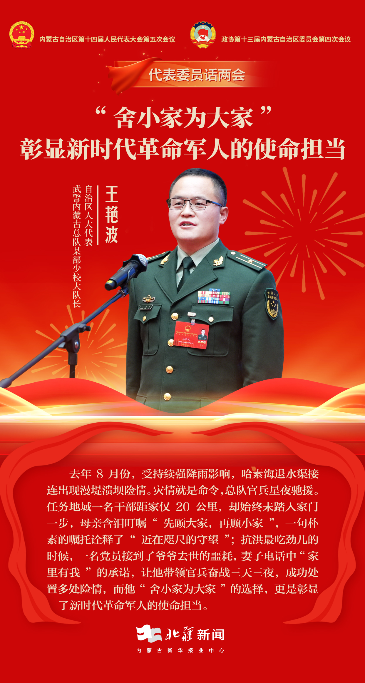 北疆新闻呼和浩特2月5日消息(记者 杨净毓 李文华 张鑫) “作为驻守祖国北疆的武警官兵,我们心中既有练兵备战的热血记忆,更有军民同心的温暖感动。”2月4日,内蒙古自治区第十四届人民代表大会第五次会议“代表通道”上,自治区人大代表、武警内蒙古总队某部少校大队长王艳波,分享了北疆卫士练兵备战、守护平安、军民同心的难忘经历与使命担当。