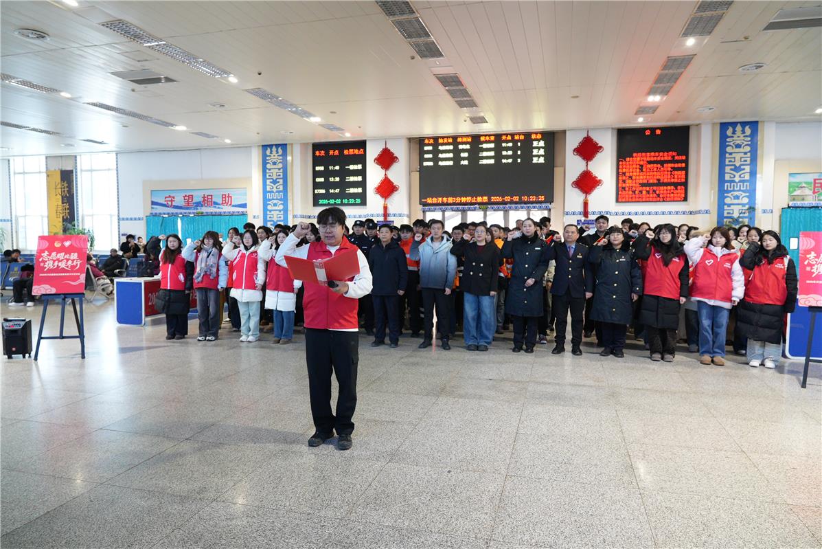 2月22日,正月初六。兴安盟乌兰浩特市刚落下一场春雪,户外寒风凛冽,乌兰浩特火车站候车大厅里却暖意融融。正值春节返程高峰,拎着行囊的旅客步履匆匆,十余名身着红马甲的青年志愿者穿梭在人群中,帮拎行李、引导进站、答疑解惑,成了春运人潮里最亮眼的一抹“志愿红”。