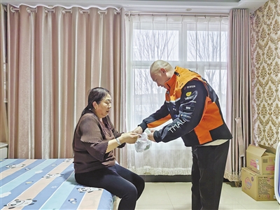 快递员为社区居民上门送药。(化德县委社会工作部供图)