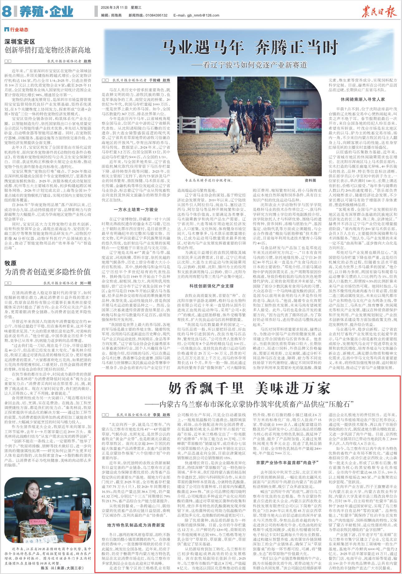 2026年3月11日,《农民日报》第8版刊发题为《奶香飘千里 美味进万家——内蒙古乌兰察布市深化京蒙协作筑牢优质畜产品供应“压舱石”》的文章,报道了内蒙古乌兰察布市是世界公认的畜牧业“黄金产业带”,也是距离北京最近的草原牧区,面向北京超2000万居民的超大体量畜产品消费需求,农畜产品销售正是京蒙协作框架“六个倍增计划”中的重要内容。