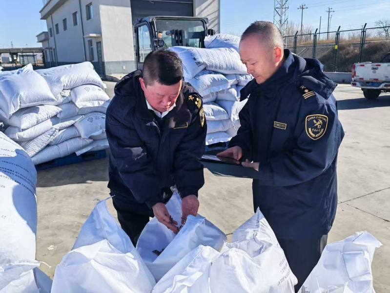 集宁海关关员对出口葵花籽进行现场查验