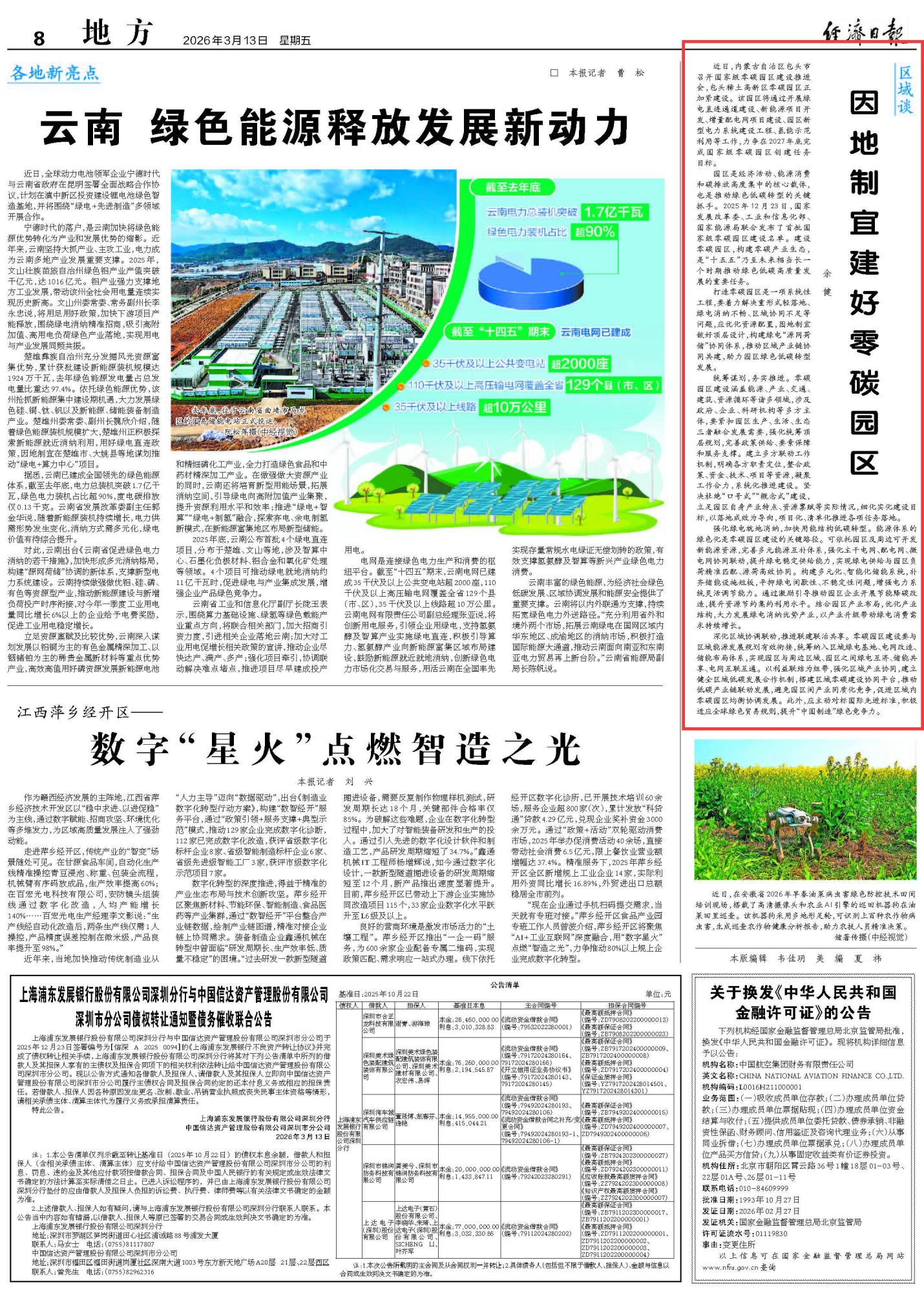 2026年3月13日《经济日报》第8版刊发了《因地制宜建好零碳园区》的文章,报道了近日,包头稀土高新区启动国家级零碳园区建设,计划 2027 年底完成创建。零碳园区是绿色低碳转型关键抓手,建设需统筹能源、产业等多领域,解决重形式、绿电消纳不畅等问题,通过优化顶层设计、强化绿电就地消纳、深化区域协同联动,以务实举措推进落地,助力高质量发展。
