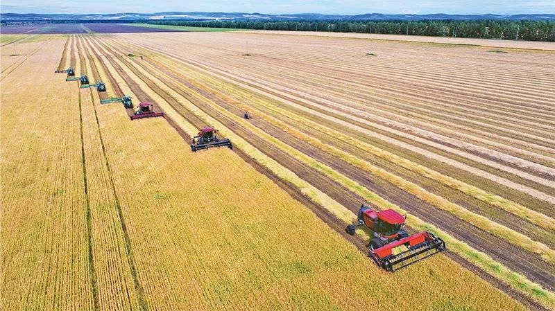 实施乡村振兴战略,必须把确保重要农产品特别是粮食供给作为首要任务,把提高农业综合生产能力放在更加突出的位置,把“藏粮于地、藏粮于技”真正落实到位。图为2022年8月17日,大型秋收机械在内蒙古呼伦贝尔农垦牙克石农牧场有限公司第四连(队)集群割晒作业。人民图片王国印/摄