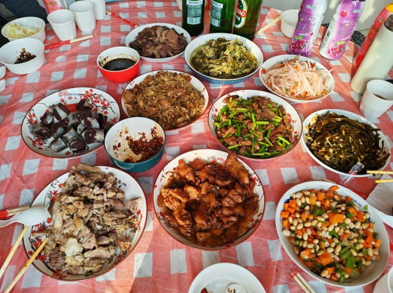 忙活了一上午,红白相间的桌布上各类菜品早已摆得满满当当,除了位居主位的杀猪菜,还多了许多“衍生作品”:酱焖肉、汆白肉、蒜苔炒肉、酸菜炒肉、凉拌猪肝、猪血肠、凉拌海带条、芥菜丝……围坐一圈的不止家人,还有左邻右舍。无需主人过多招呼,筷子便纷纷探向锅中。窗外寒风渐歇,雾气也被阳光驱散,而在温暖的屋子里,锅气蒸腾,模糊了窗上的冰花,也润湿了每一双带着笑意的眼睛。这不仅仅是一顿饭,更是乡里乡亲们对生活最热烈的拥抱。
