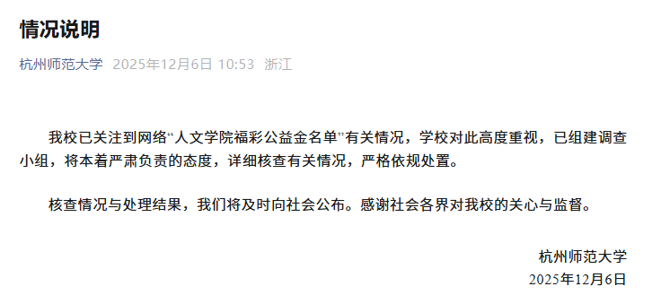 杭州师范大学福彩助困公益金名单造假?校方通报:组建调查小组